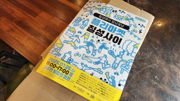 얼마 후 7월 26일 토요일, '청량마켓 칠성사이' 이름을 걸고 폭염 재난문자를 지워가며 칠리단 청년들 중심으로 첫 플리마켓이 열렸어요. 칠리단 청년들이 뒷골목 마켓으로 나오면서 비워진 상점들에는 에어컨을 빵빵하게 켜고 무더위 쉼터로 무인 개방하는 센스가 특히 돋보였죠.